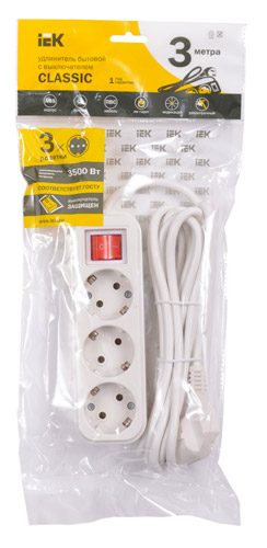 - Удлинители бытовые с выключателем: на 2, 3, 4 и 6 розеток, длины 1.5, 3.0 и 5.0 метров;