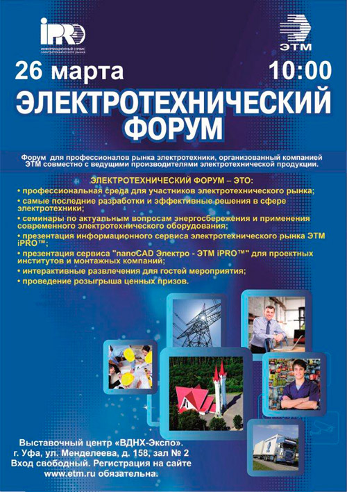 Электротехнический форум ЭТМ состоится по адресу: г. Уфа, ул. Менделеева, д. 158, выставочный комплекс ВДНХ-Экспо. Начало в 10:00. Вход бесплатный. Регистрация на сайте http://www.electricforum.ru обязательна.