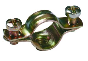 - скоба металлическая двухкомпонентная. Служит для крепления труб и металлорукава диаметром от 10 до 50 мм. Цвет белый, материал: оцинкованная сталь;