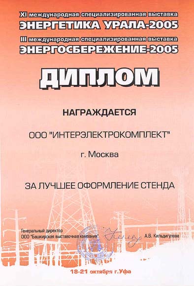 На прошедших накануне региональных выставках: «Энергетика Урала-2005» и «Энергосбережение – 2005» решением руководства Башкирской выставочной компании стенд Группы компаний IEK был отмечен как лучший. Оценивалось дизайнерское оформление выставочного стенда, его привлекательность для посетителей и информативность. Группа компаний IEK награждена памятным дипломом.