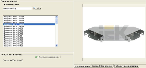 Помимо раздела «Проект» в Программе также имеется встроенный каталог продукции IEK «Металлические прокатные и проволочные лотки и аксессуары». В данном разделе пользователь имеет возможность ознакомиться с техническими характеристиками тех или иных изделий, узнать несущую способность данного типа лотков, оценить вес и габариты изделий, способы соединений аксессуаров и лотков между собой. К каждой позиции в каталоге присоединено фотоизображение продукции. В каталоге также реализован поиск изделий по названию.
