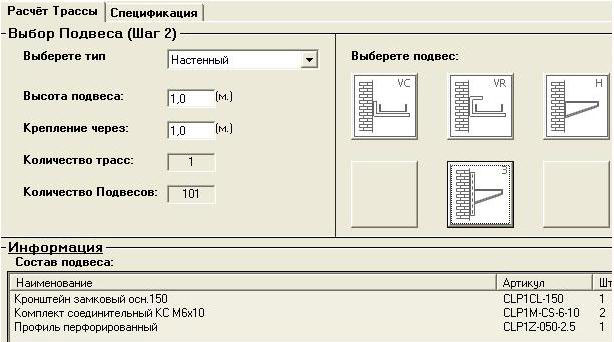 В составе Программы имеется удобный инструмент «Проект», позволяющий безошибочно комплектовать трассу любой конфигурации всем необходимым, включая метизы. Например, пользователю предлагается на выбор два вида подвеса лотков: потолочный и настенный. В каждом виде подвесов предлагается на выбор еще до 5 подтипов в зависимости от выбранного лотка.