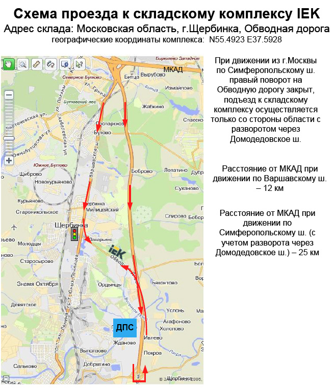 При движении из Москвы по Симферопольскому шоссе правый поворот на Обводную дорогу закрыт, подъезд к складскому комплексу осуществляется только со стороны области с разворотом через Домодедовское шоссе.