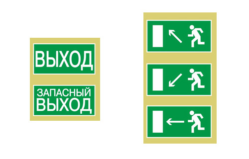 Знаки направления движения выпускаются разных типоразмеров. Для использования в комплекте со светильниками серии ЛБА предназначены наклейки формата 50×50 и 100×50, указывающие направление к эвакуационному выходу и места расположения выхода и запасного выхода. Использование специальных наклеек в комплексе со светильниками ЛБА значительно расширяет функционал светильников с аварийным блоком питания и позволяет использовать их как аварийные эвакуационные светильники.
